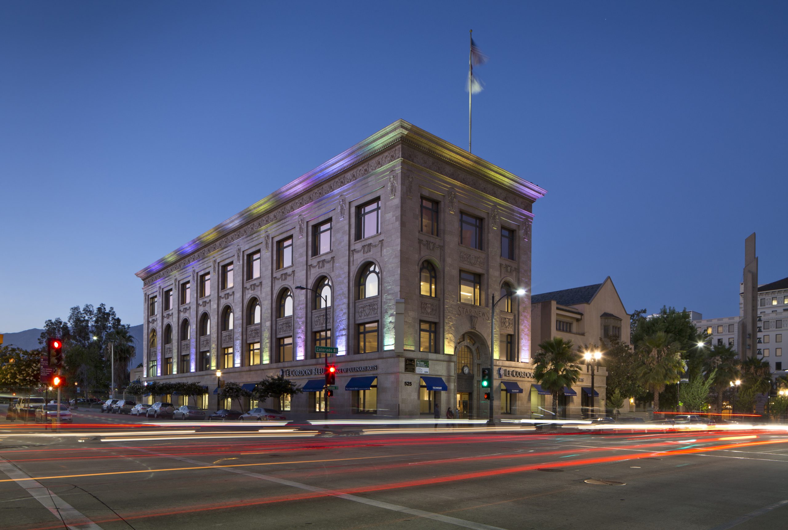 Located in the heart of Pasadena, the historic Star News Building was built in 1914 and features beautiful irreplaceable architecture within the Colorado Playhouse district. The Star News building is home to Le Cordon Bleu, 24 Hour Fitness and is walking distance from Paseo Colorado.